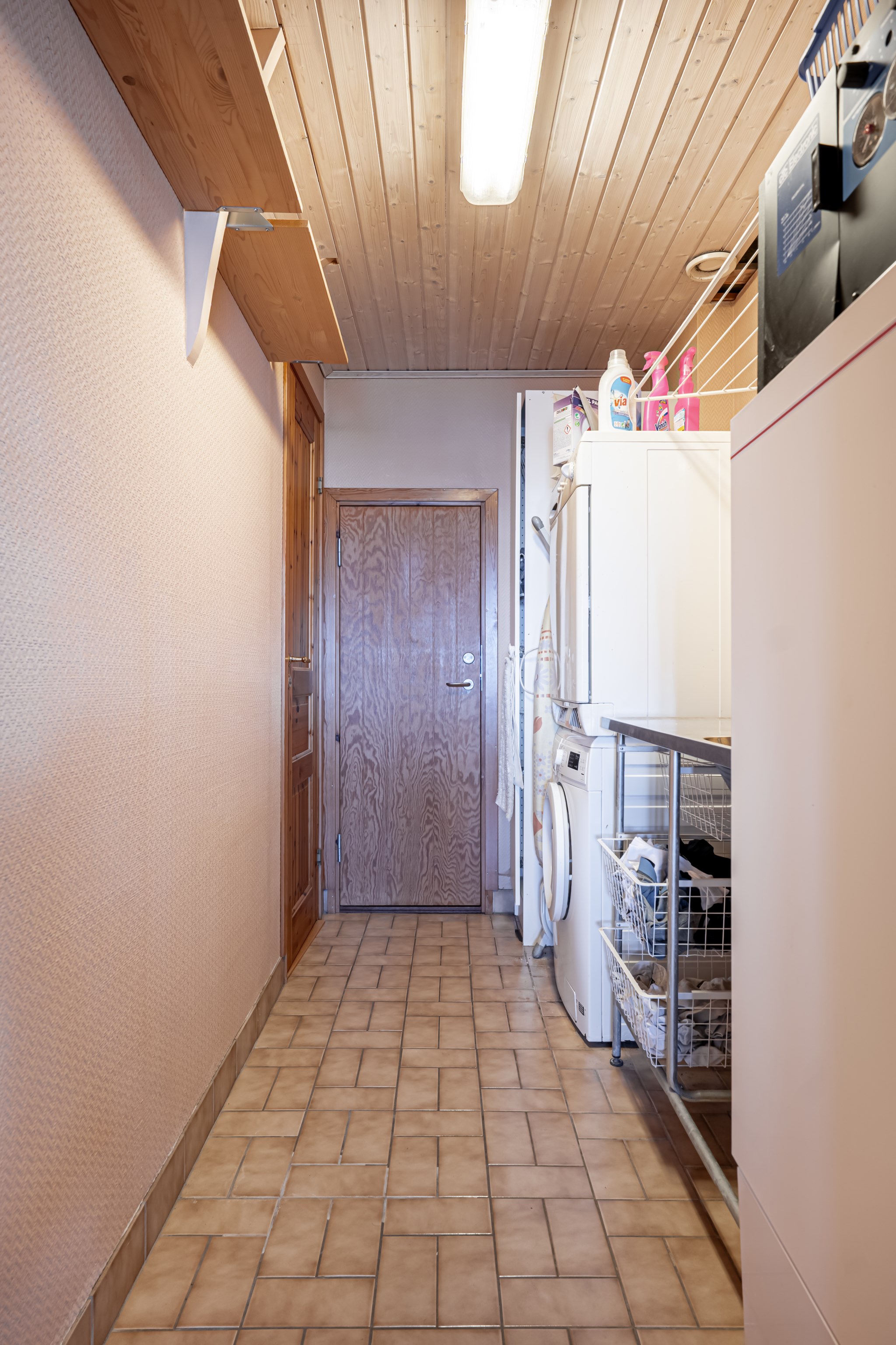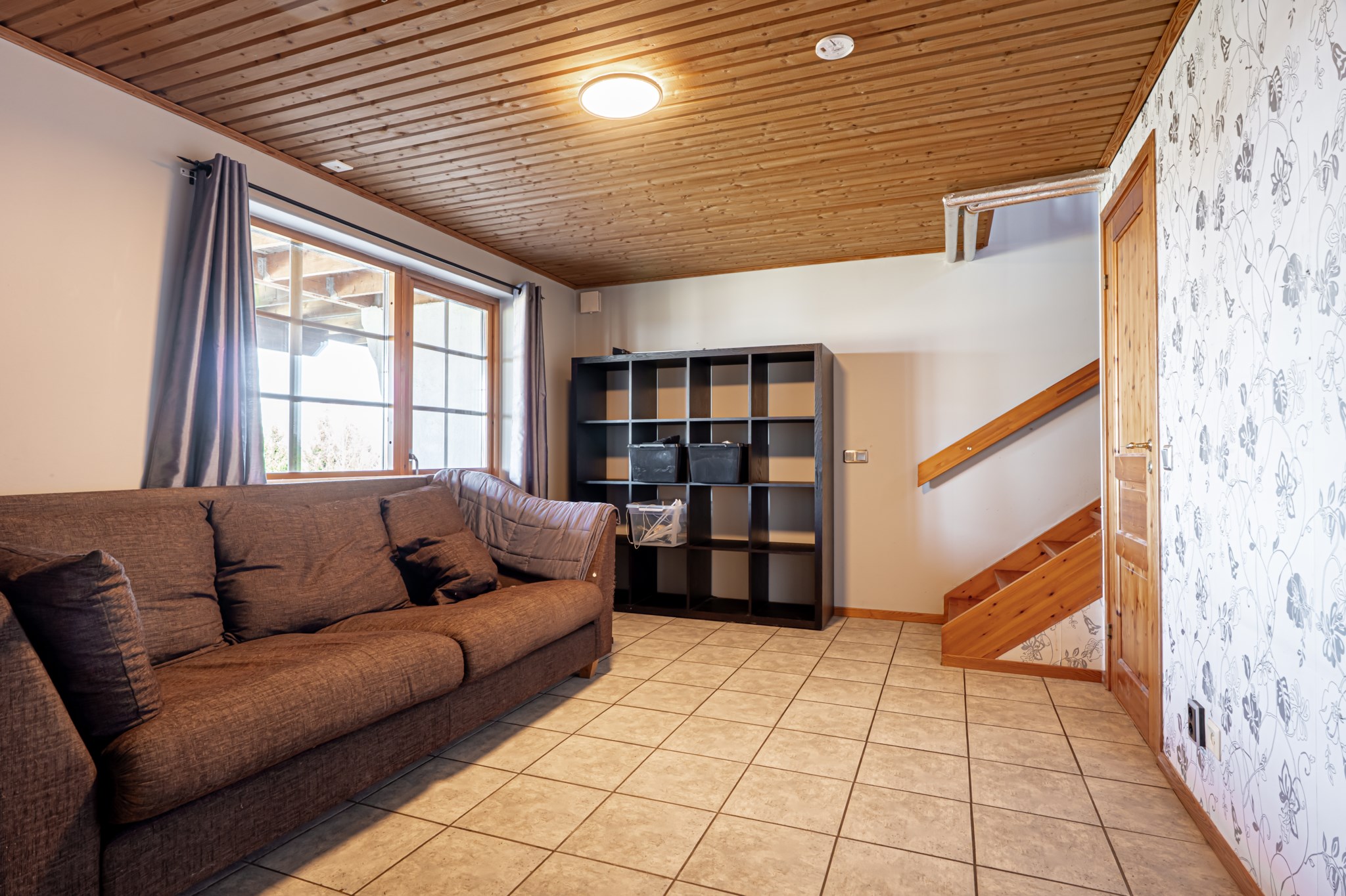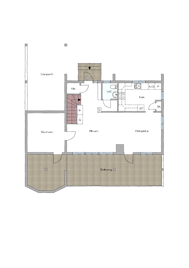 En trappa ned finns ett allrum med utgång till nedre terrassen samt 2 sovrum. Stort badrum samt tvättstuga/apparatrum där även husets värmepump är placerad. I anslutning till tvättstugan finns även ett litet källarutrymme som är lämpligt som mat/vinkällare. I sluttningsvåningen finns även ett förråd med ingång från utsidan.