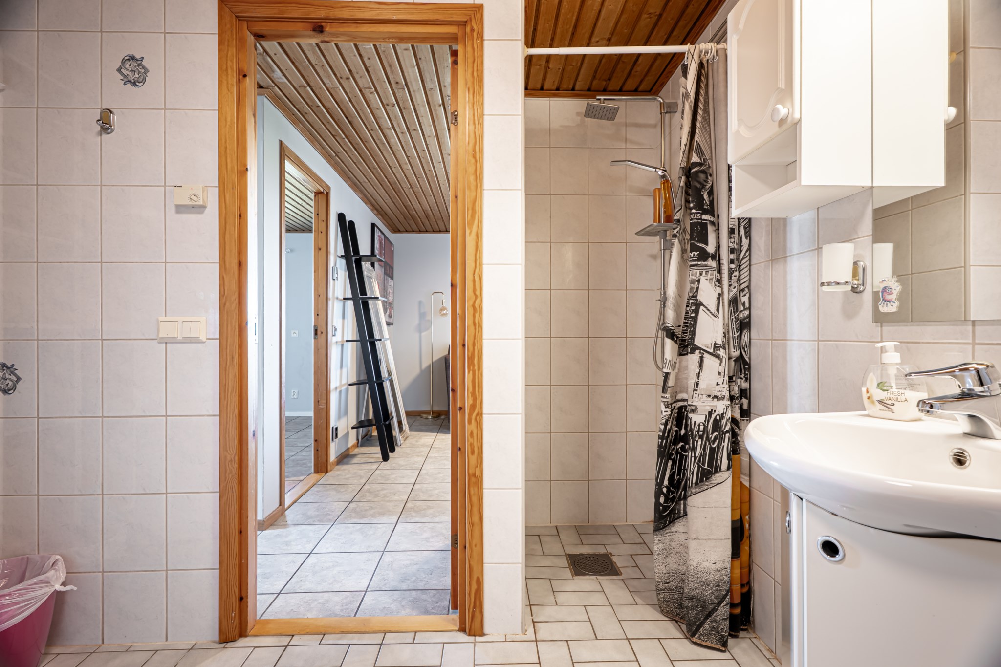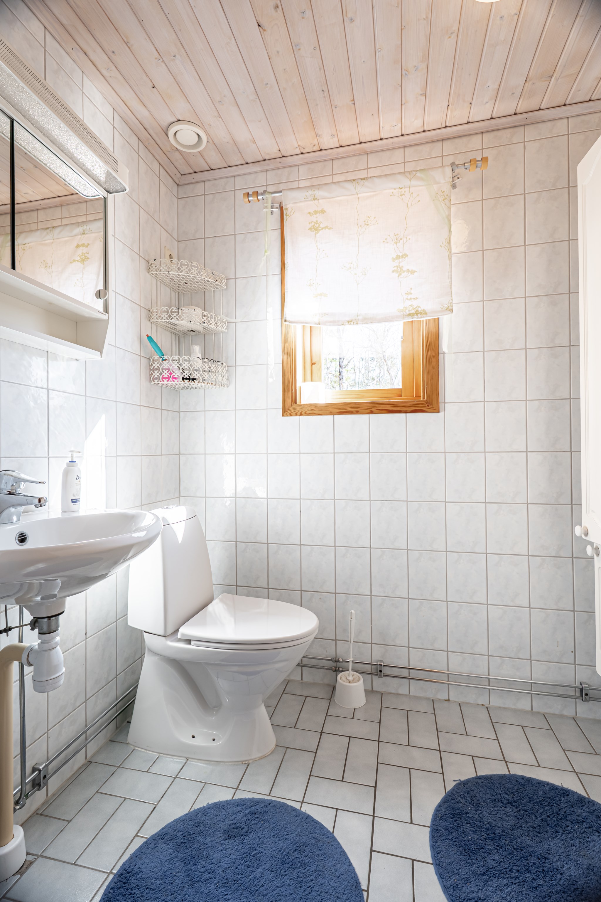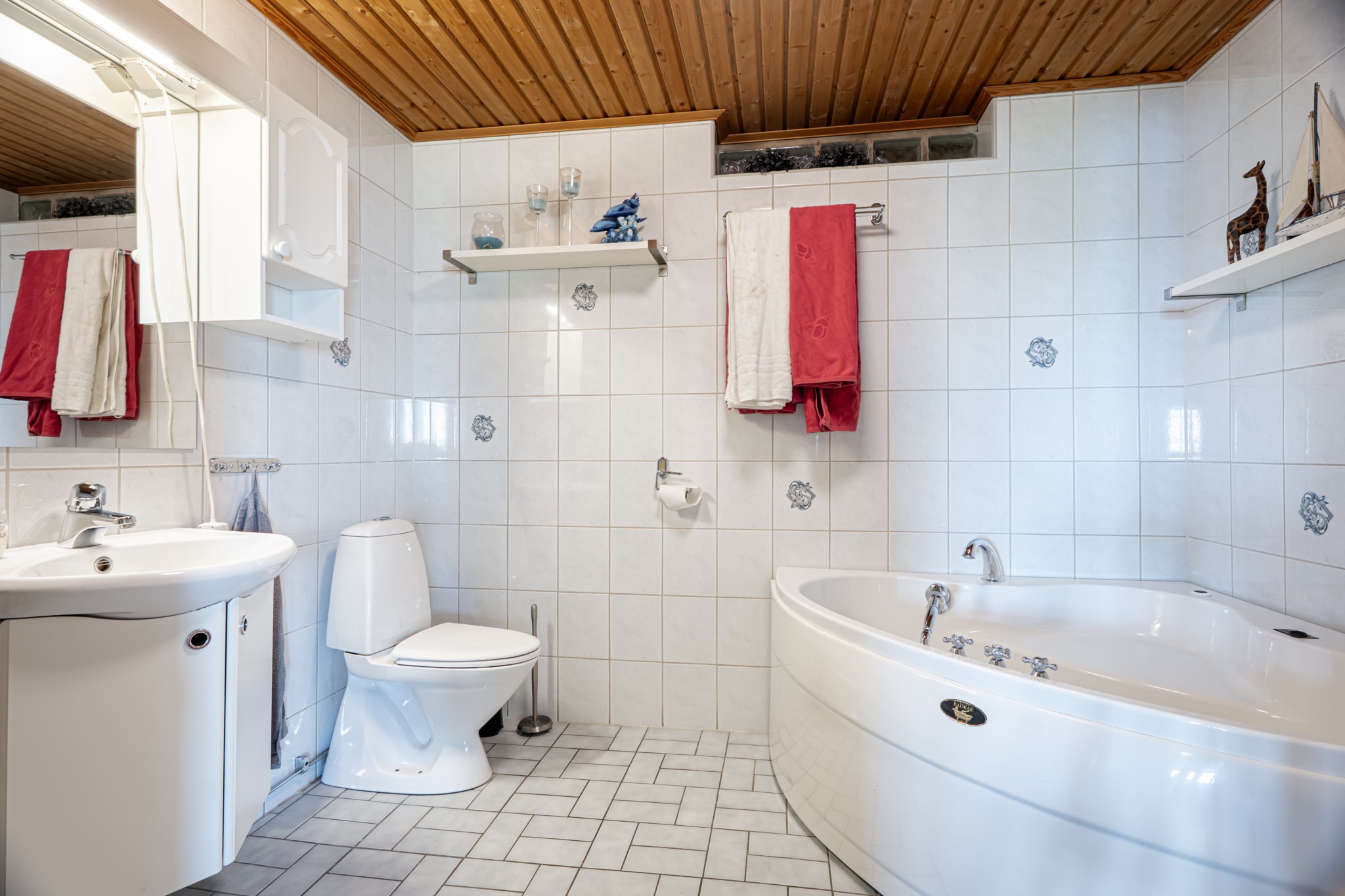 Gäst wc på övre plan är helkaklat med tvättställ och wc, golvvärme. Badrummet i sluttningsvåningen är helkaklat med hörnbadkar samt separat dusch, wc och tvättställ, golvvärme.