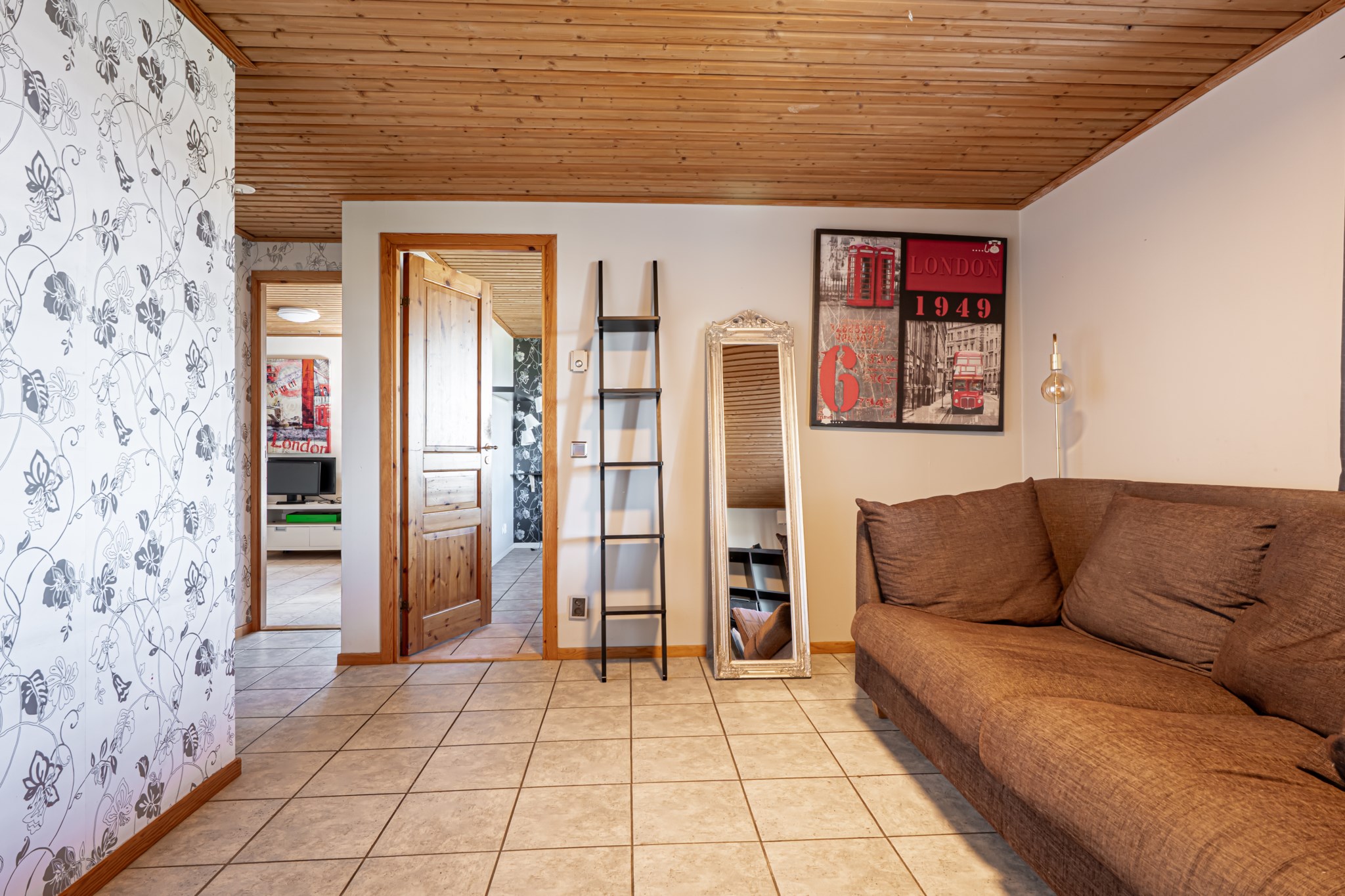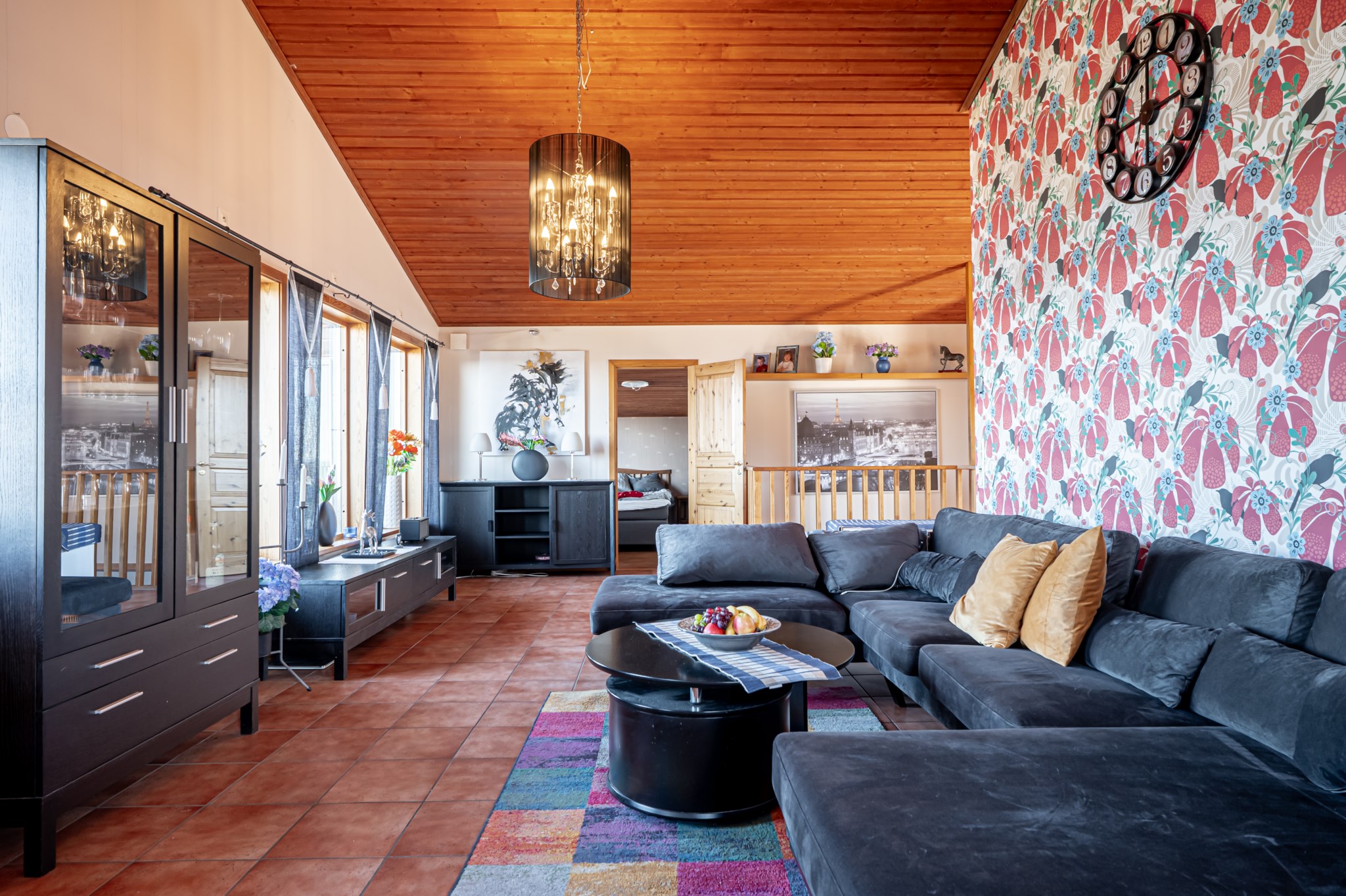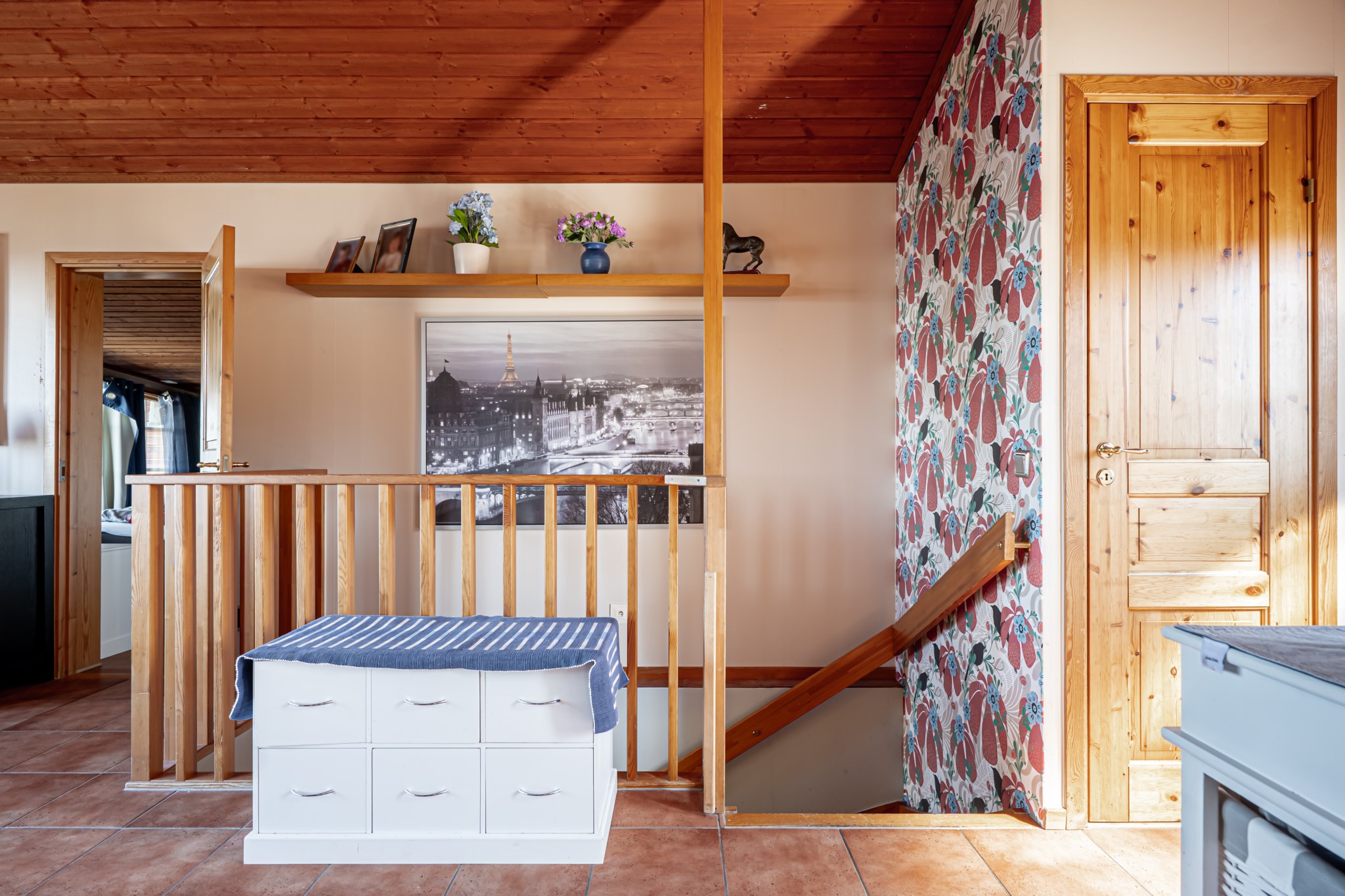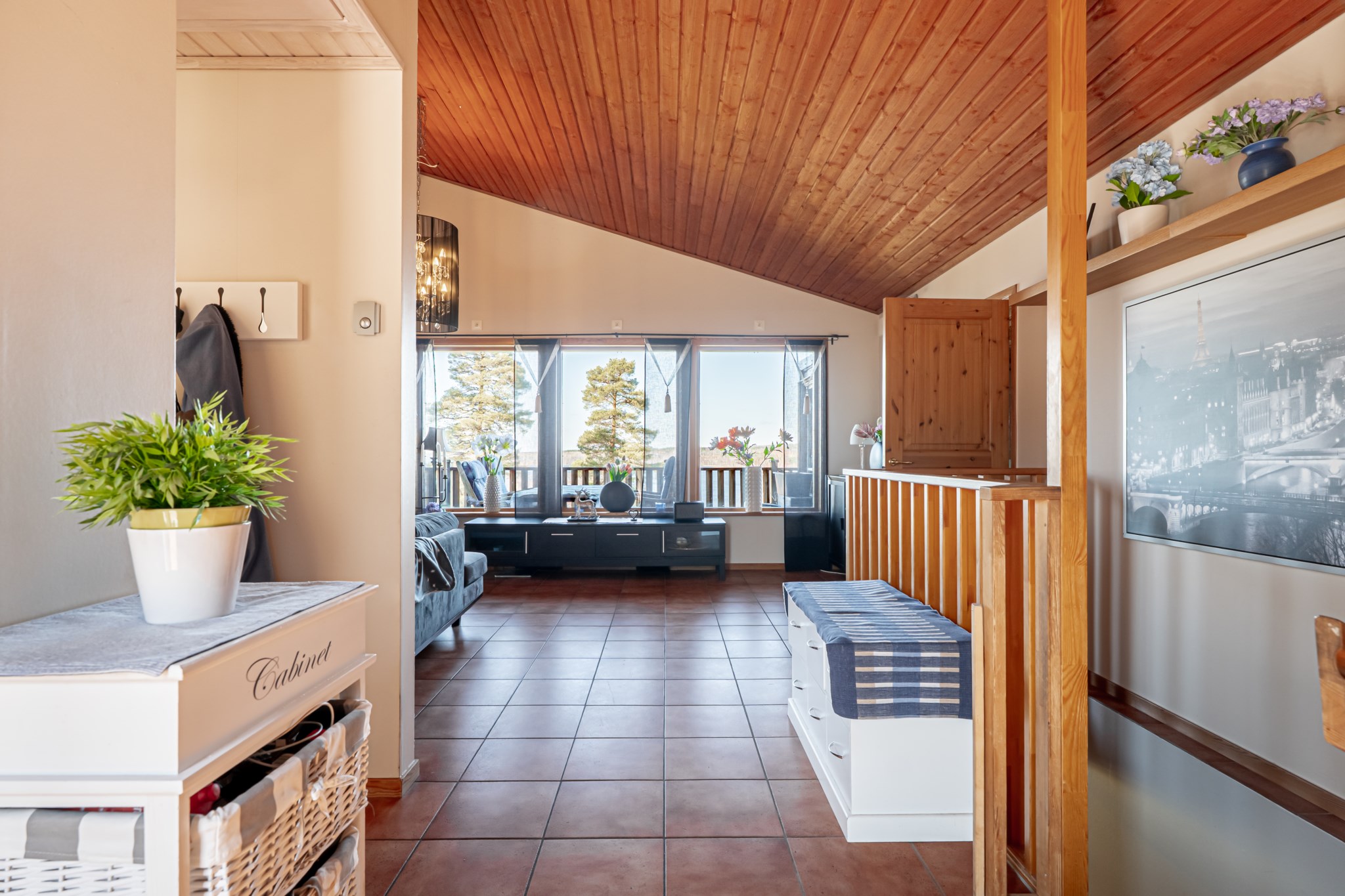 Välkommen in i hallen med ett litet kapprum, klädkammare och gäst wc. Vidare kommer man in i vardagsrum - matrum med ryggåstak som ger rummet volym och en härlig vy mot sjön samt utgång till den stora terrassen. I anslutning till vardagsrummet ligger köket med matplatsen som en del i vardagsrummet. Ett sovrum med snedtak finns även i detta plan.