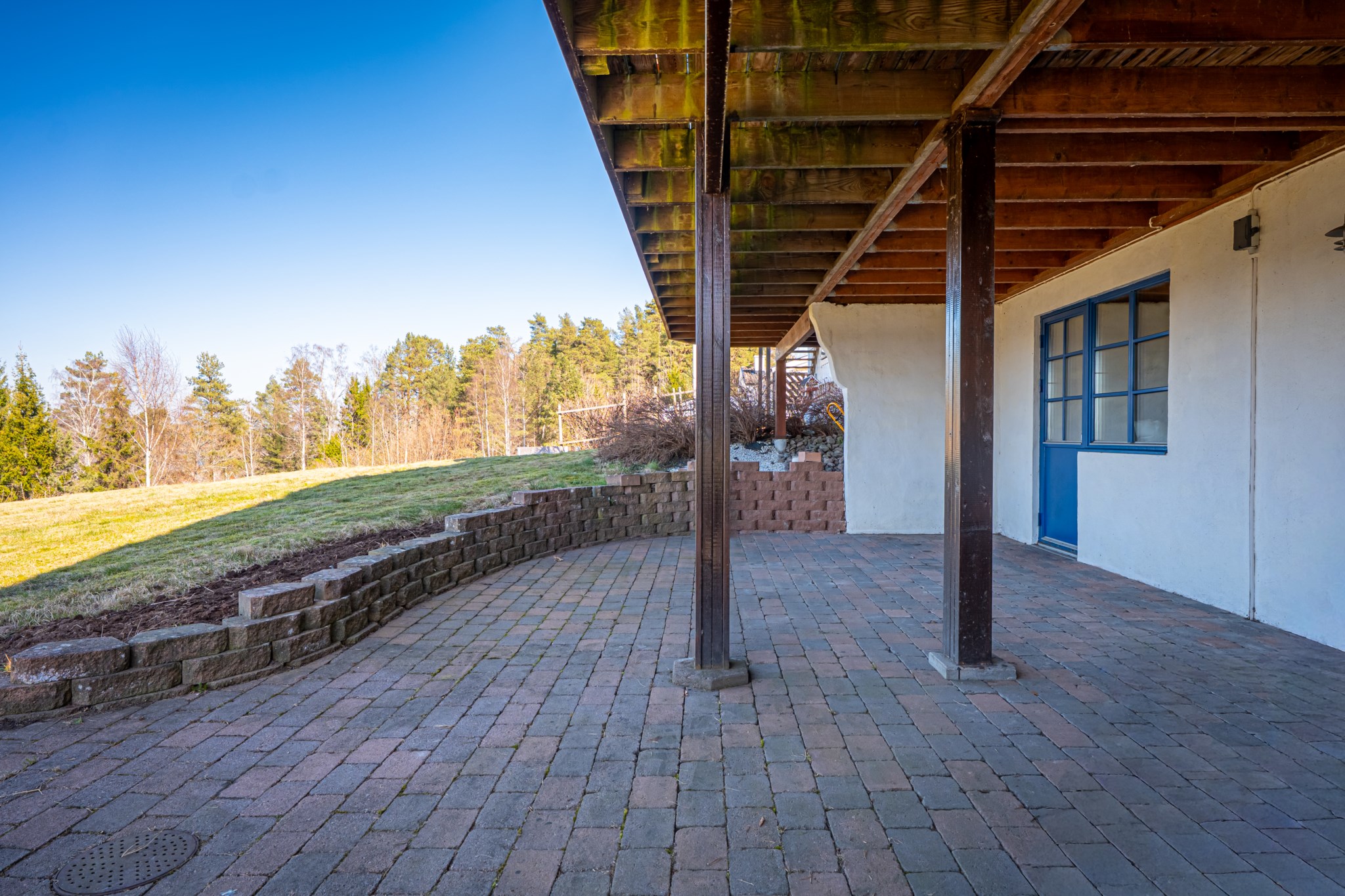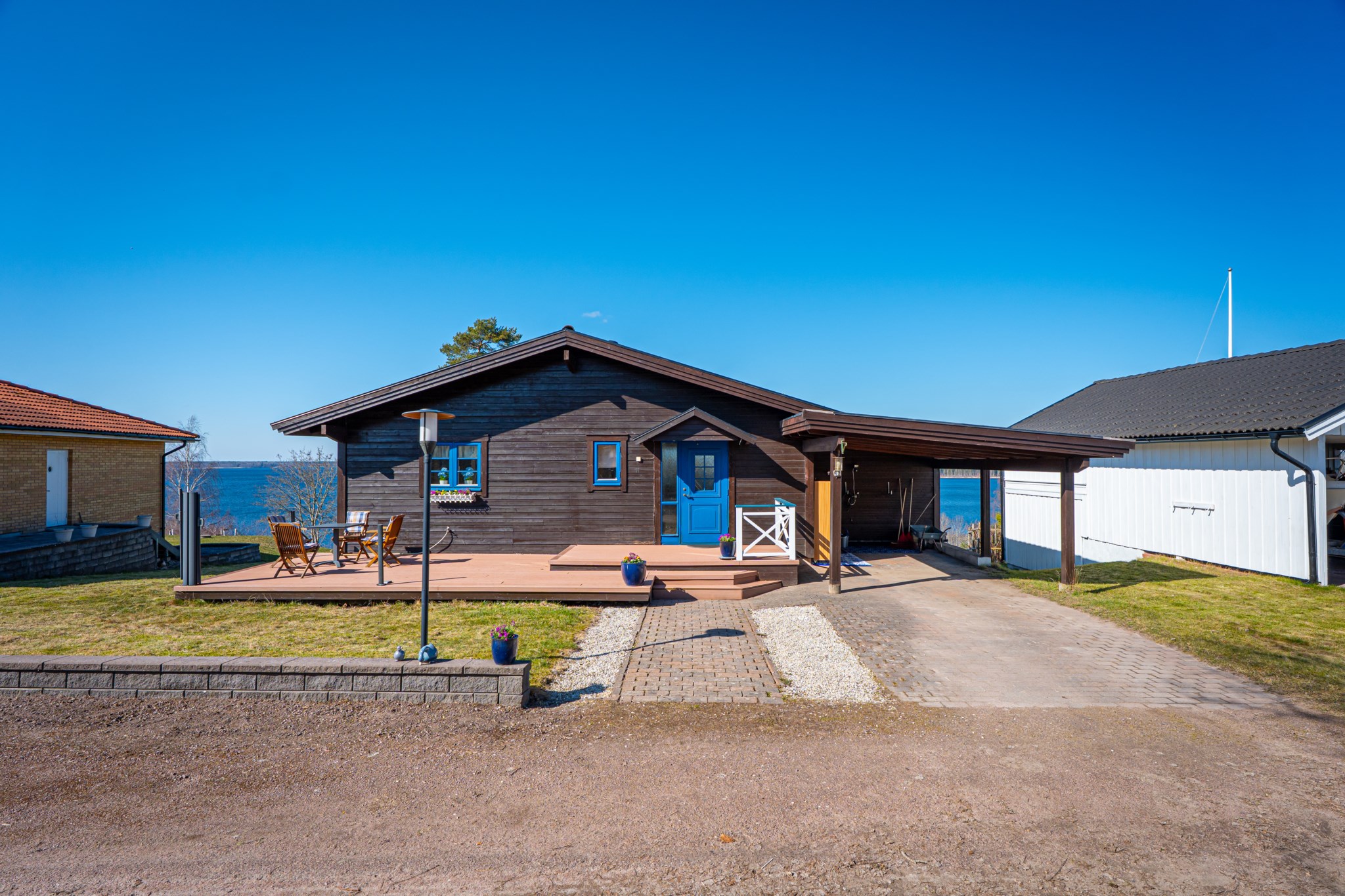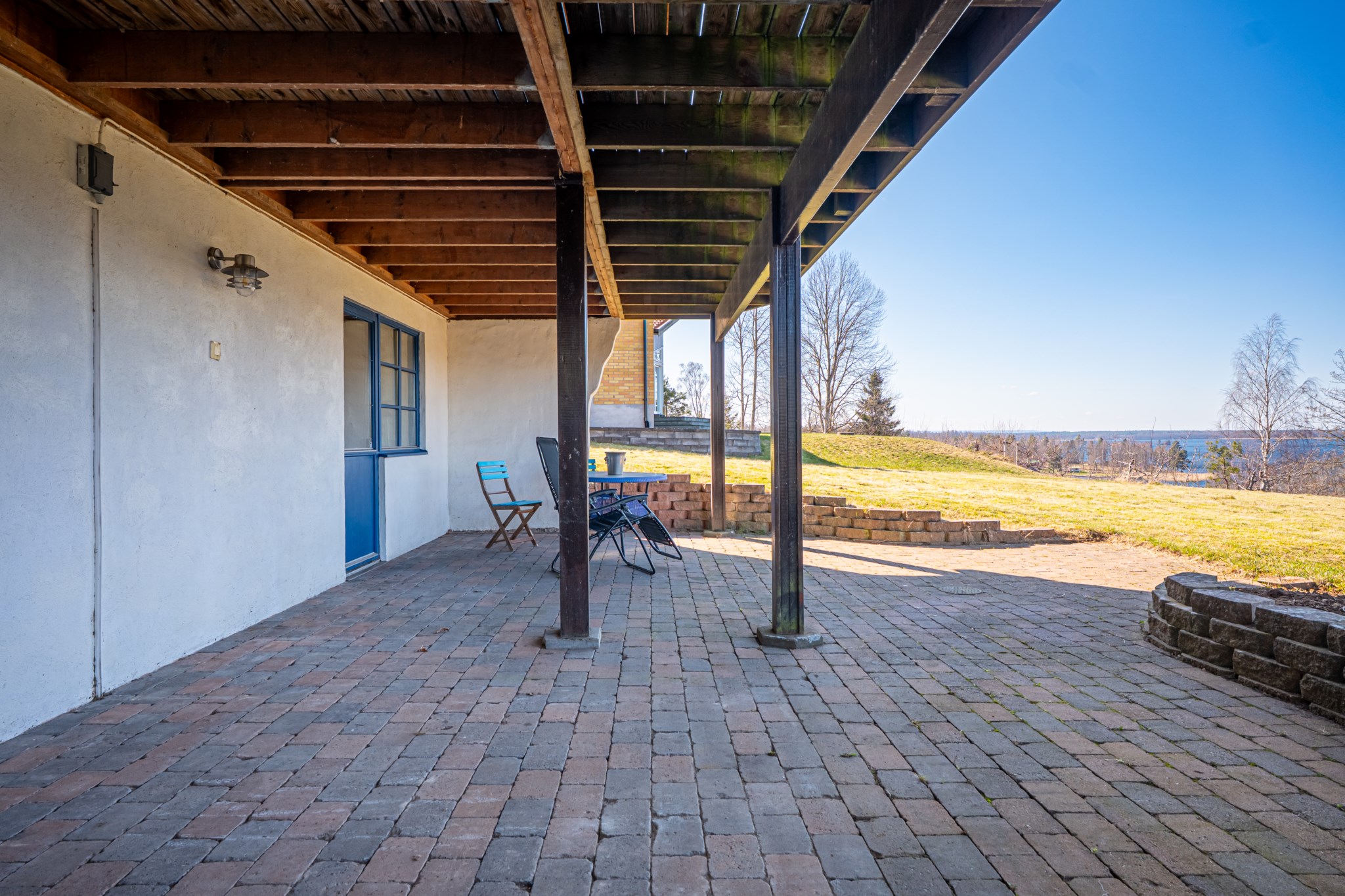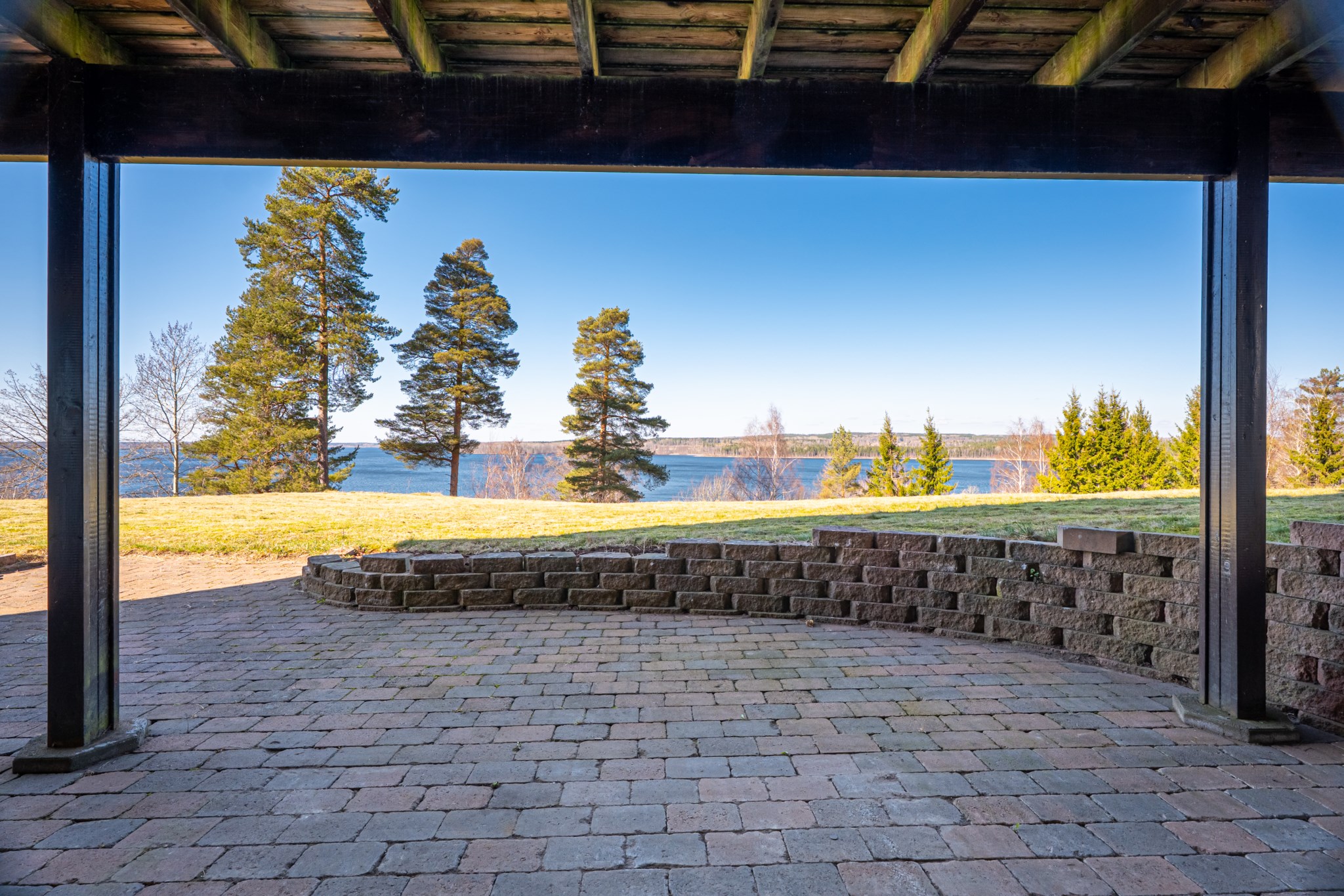 På framsidan ligger ett terrassdäck i anslutning till entrén i komposit. Här har man morgonsol fram till efter lunch. Från vardagsrummet når man den stora generösa terrassen mot sjön som till stor del är överbyggd, del av denna terrassen är även inglasad med ett uterum. I markplan på västersidan ligger även en stensatt terrass även denna med fin utsikt över Örlen.