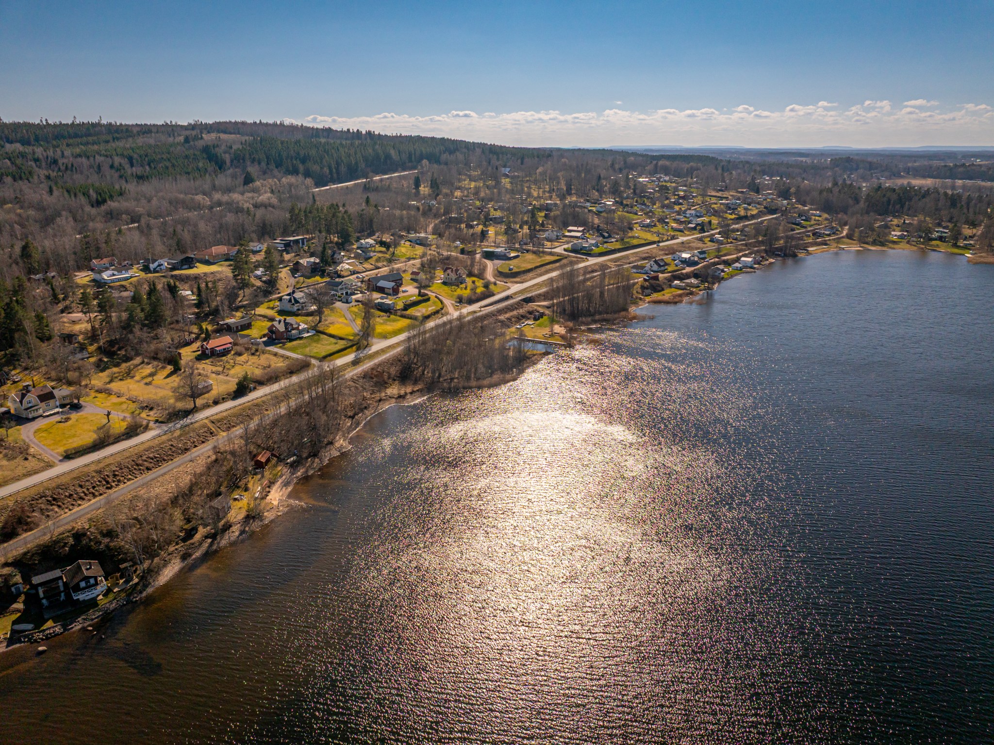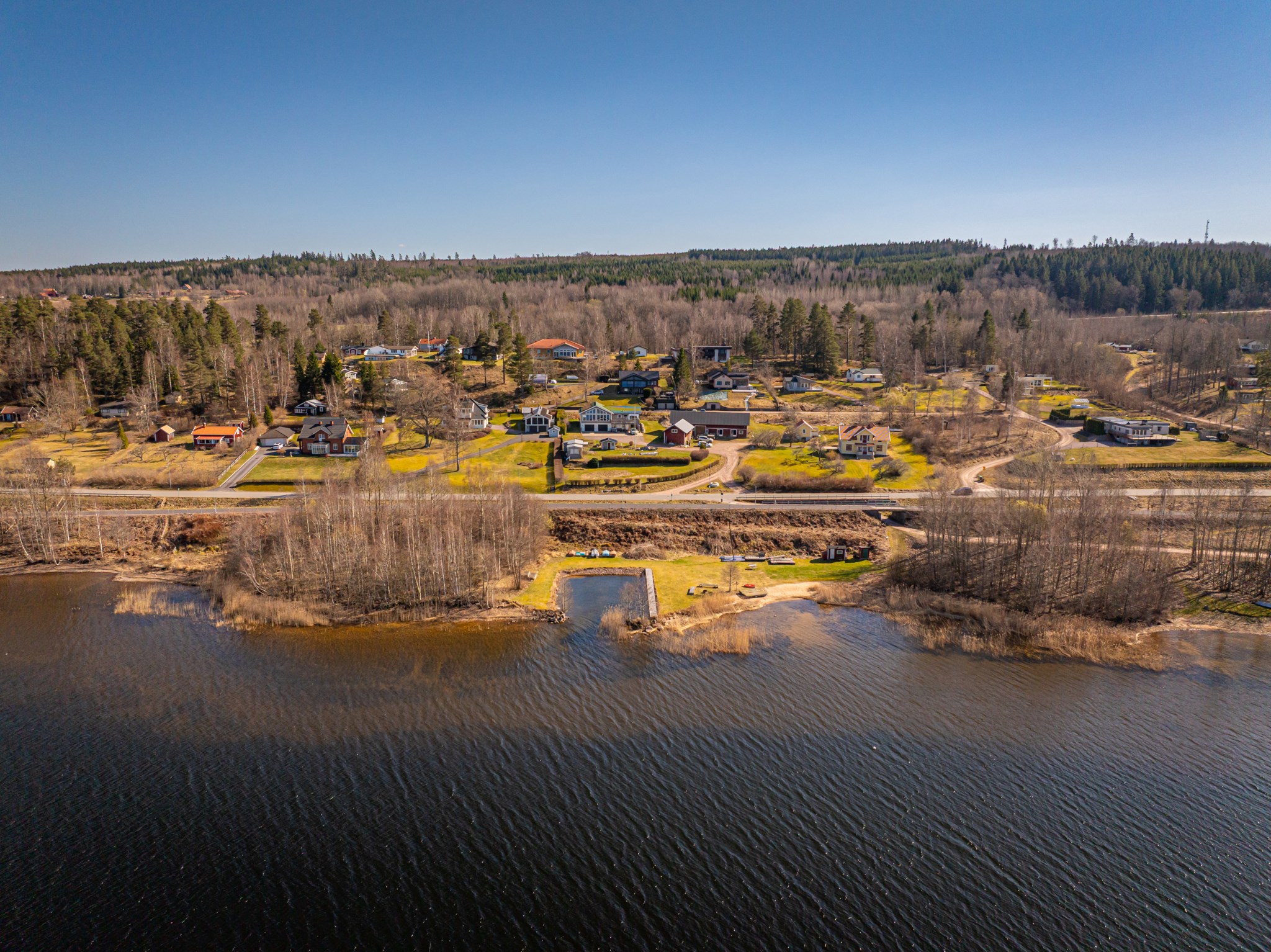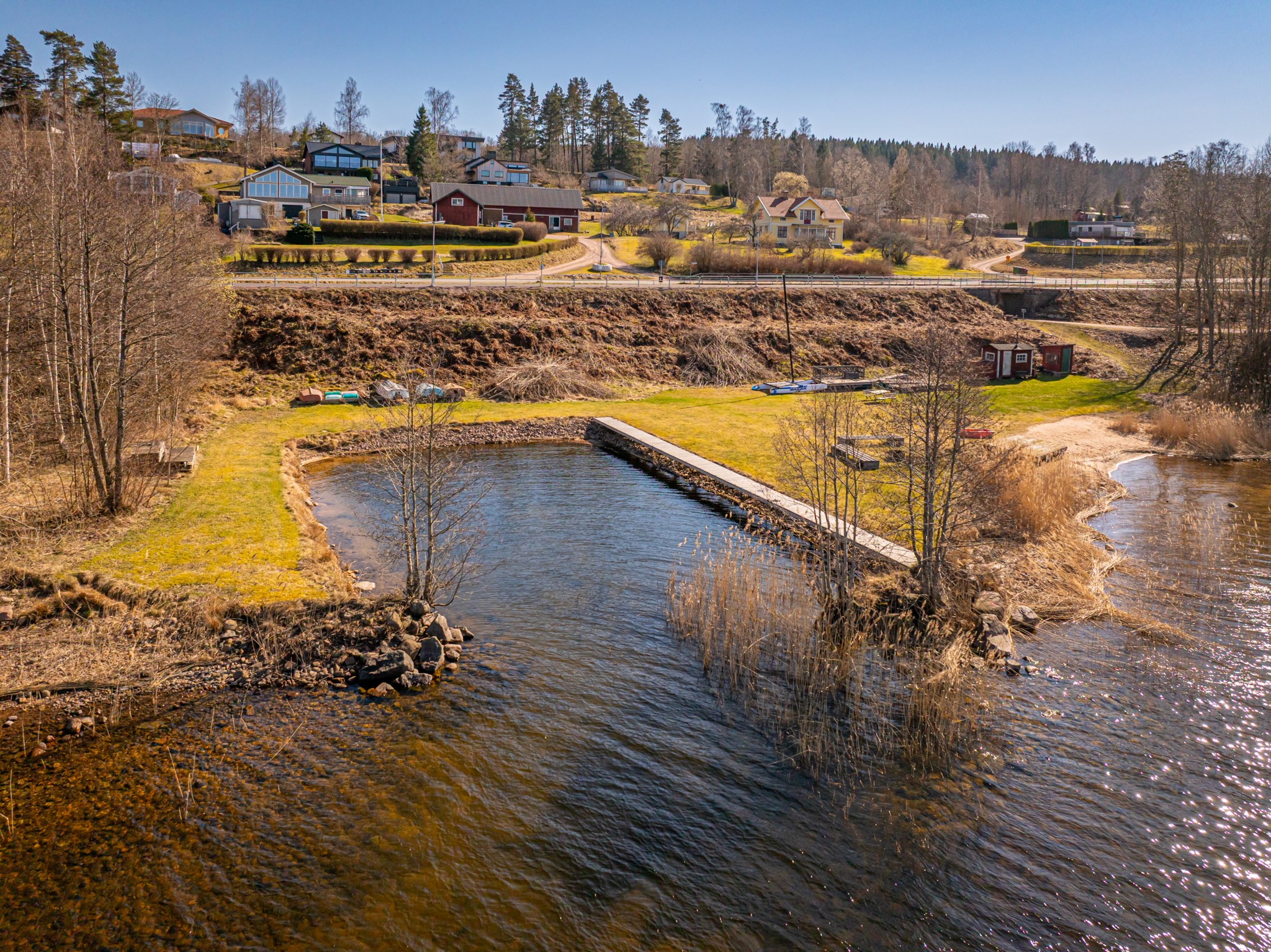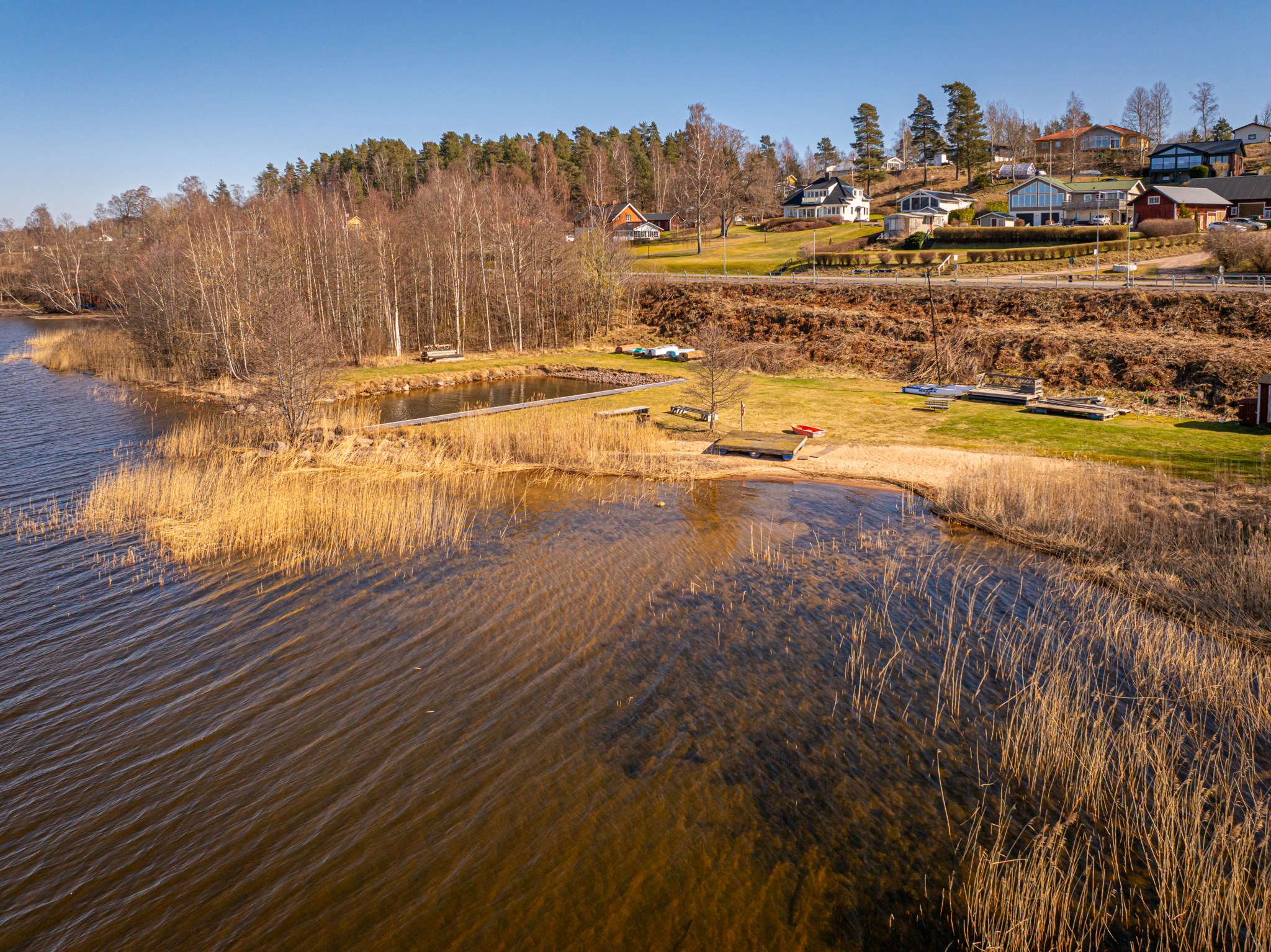 Området har tillgång till en fin sandstrand nere vid sjön nedanför undergången till höger.