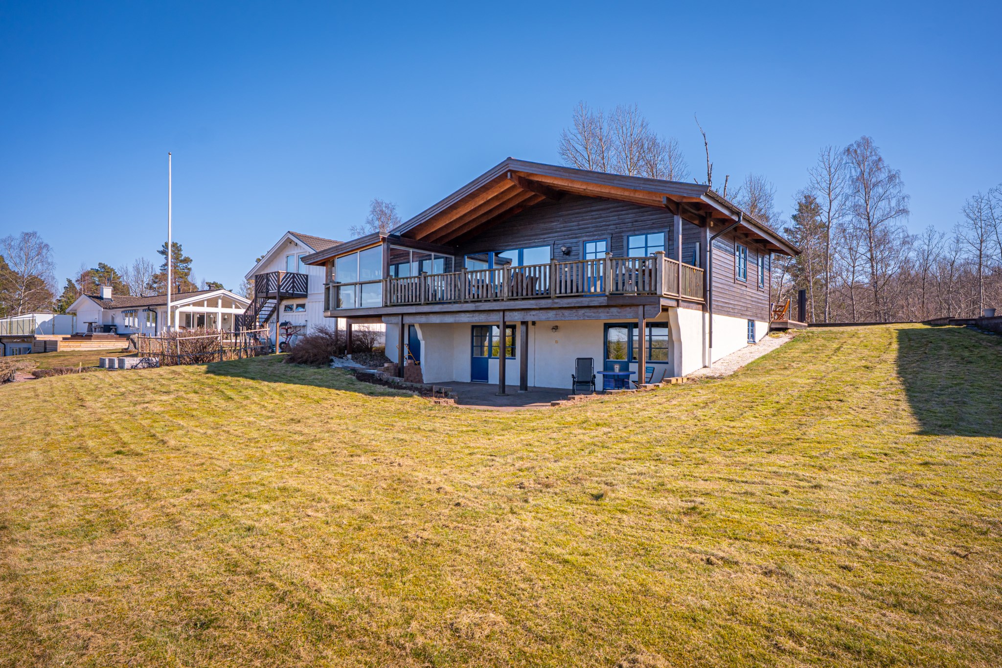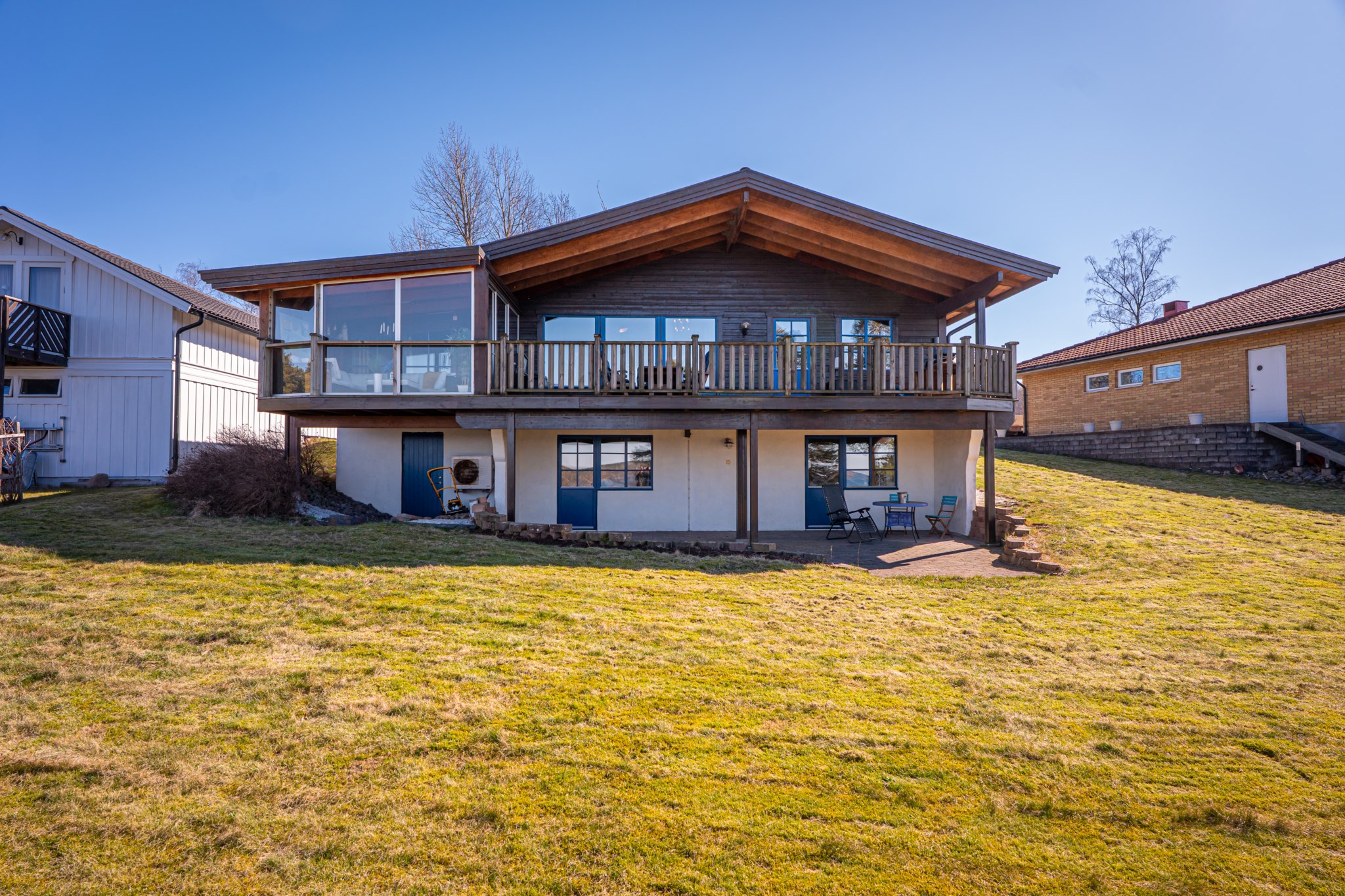 Med ett högt läge och fria vyer över sjön ligger denna sluttningsvilla från 1997 byggd med inspiration från Alperna. Stora terrasser i väster med hänförande utsikt och solnedgångar som imponerar.
