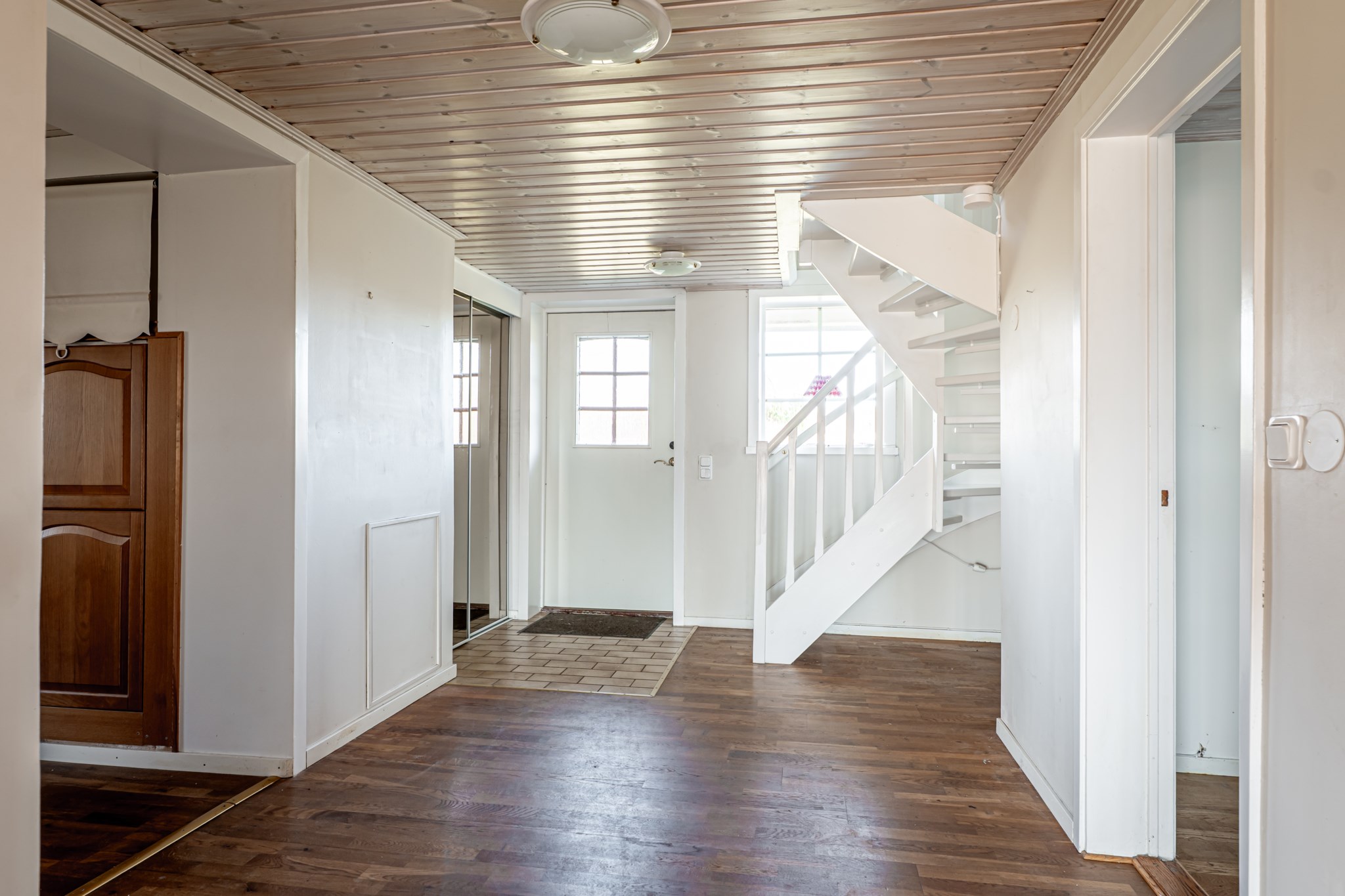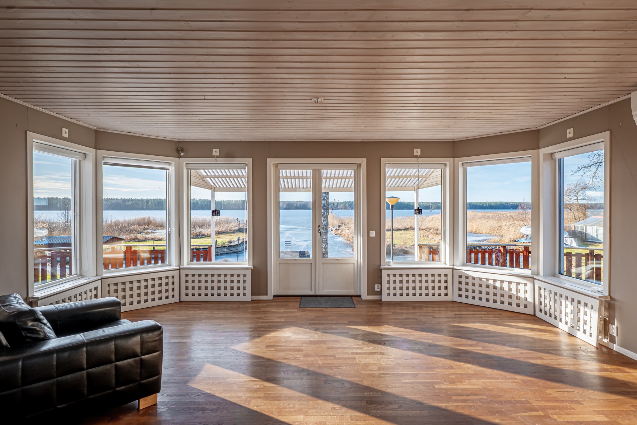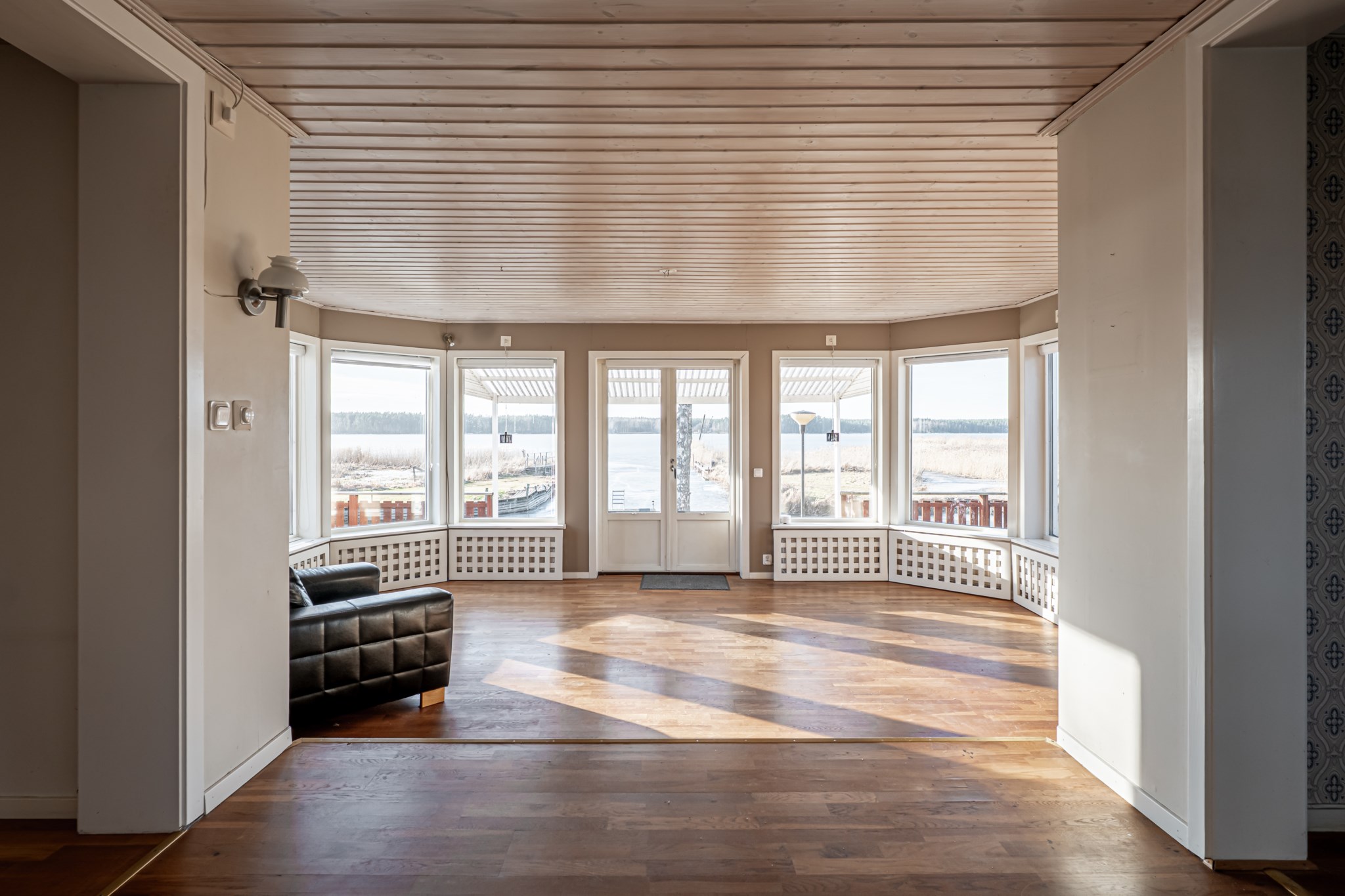 Väl innanför ytterdörren möts vi utav vattenspegeln direkt tack vare den fria sikten ifrån hallen genom huset ut mot Vänern. I entréplanet hittar vi även ett rymligt kök med plats för matbord. Ifrån köket nås vardagsrum och matsal som ligger centrerat i huset med fönster ut mot vattnet. I detta plan har vi även ett kontor samt badrum.