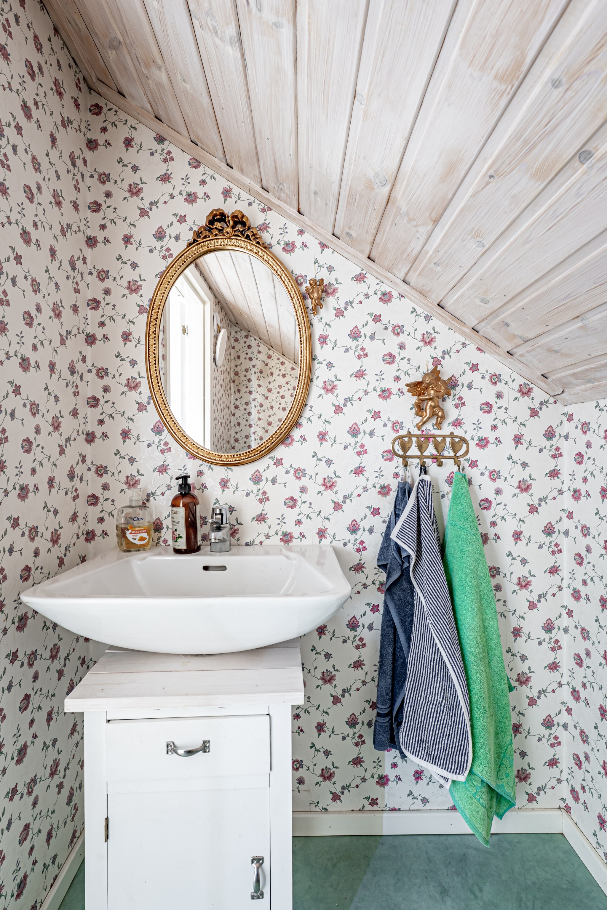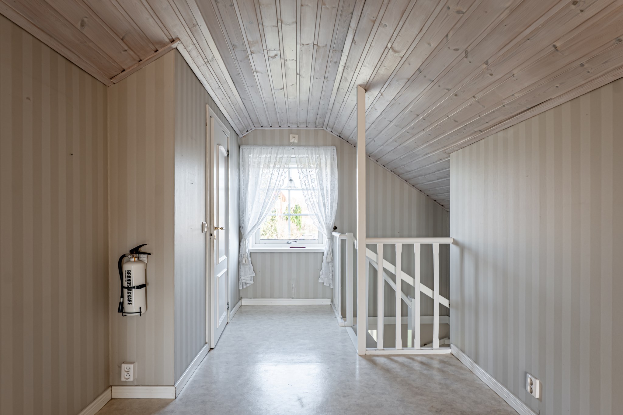 En trappa upp finner vi två sovrum varav det ena nyttjas som förråd, ett allrum med utgång till balkongen och en toalett.